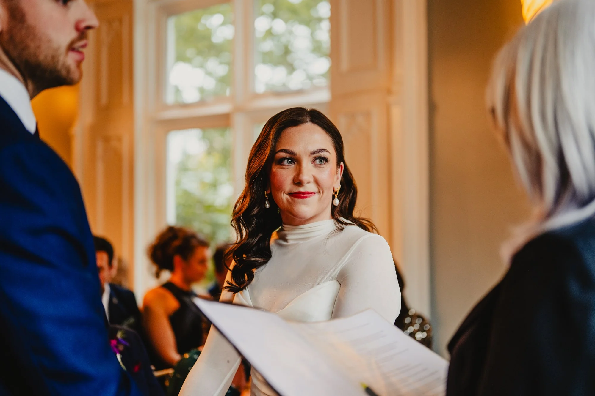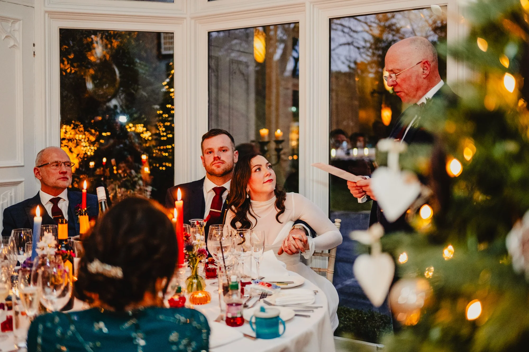 The ceremony room is quite small, but it comfortably accommodated all the guests, as well as me and my second shooter, a guitarist and a rather fetching Christmas tree. The ceremony happens in front of a large bay window, meaning the couple were lit naturally throughout the ceremony. They were accompanied by their beautiful toddler, and the strength emanating from the three of them as a perfect little unit was tangible.
