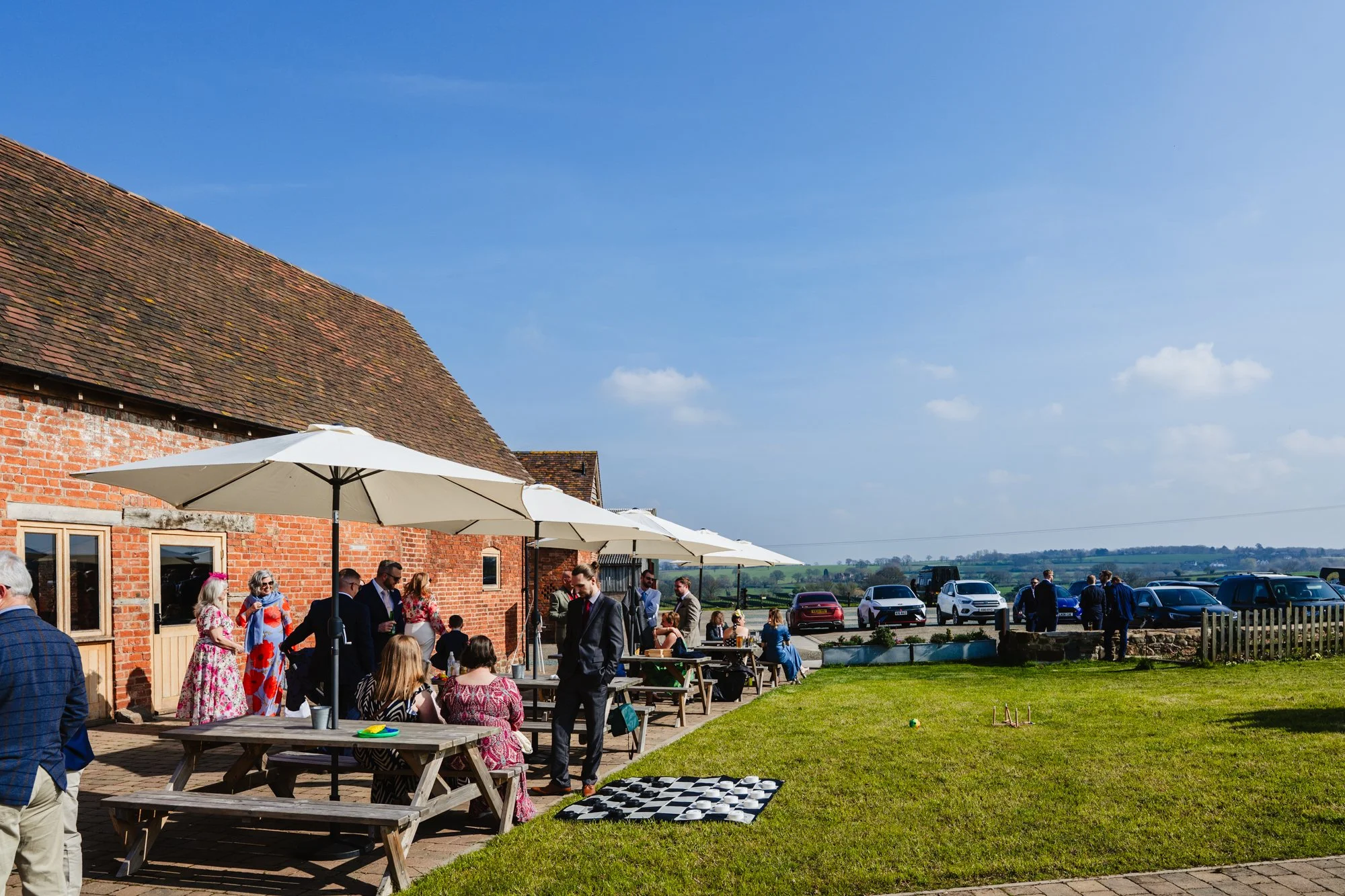 Katie and Luke got married in the barn at Moat Hall Barns on a gorgeous spring day in March. The daffodils were in bloom and it was warm and sunny - a winning combination for photos. They were joined by family, friends, and their two very cute doggos. I joined them for 3 hours to capture their ceremony, some group and couple photos, and capture some candid moments in a relaxed way. Guests played games, relaxed with a drink and chatted away in the sunshine, with the rolling Shropshire hills in the distance.