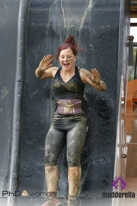 A rare moment of pride as I slid down a vertical slide at the end of a mud run - and at the end of 6 months of low-carbing for my wedding.