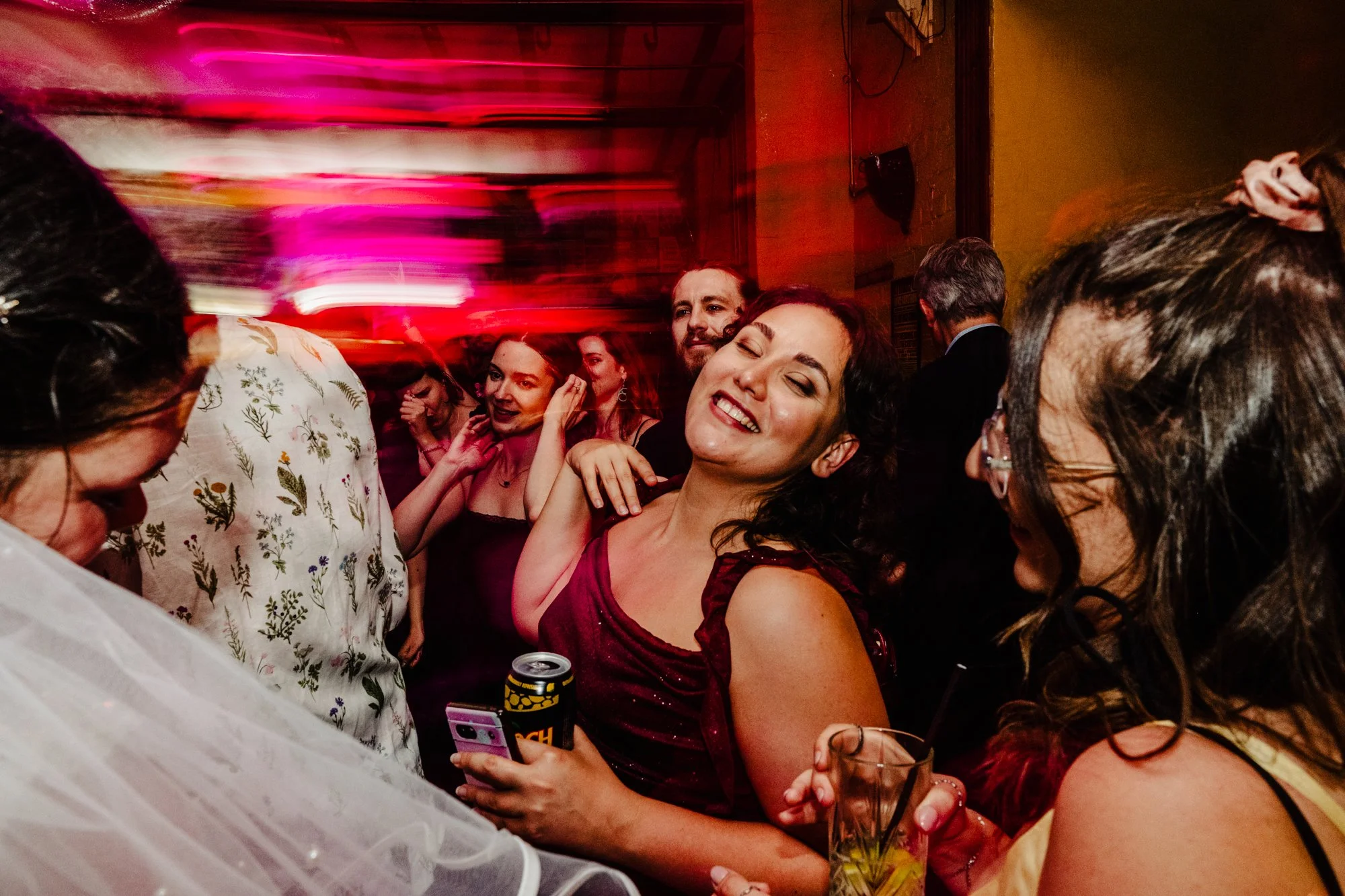 Bridie got ready with her mum, sister and best mate at a flat in Kelham Island, then walked down to Yellow Arch Studios to meet Marcus. They entered their ceremony together, for which the aforementioned best mate, Kitty, acted as celebrant. Two readings from other friends, and lots of emotion later, it was time to celebrate their union with a lot of laughter and espresso martinis. Guests helped themselves to crisps instead of canapés, and some custom temporary tattoos. I was particularly fond of the tattoo of their Japanese Spitz, Fet, who is the extremely fluffy dog you’ll see in the photos. Then on to dinner, and speeches, then a quick outfit change and back for a proper party. So without further ado…